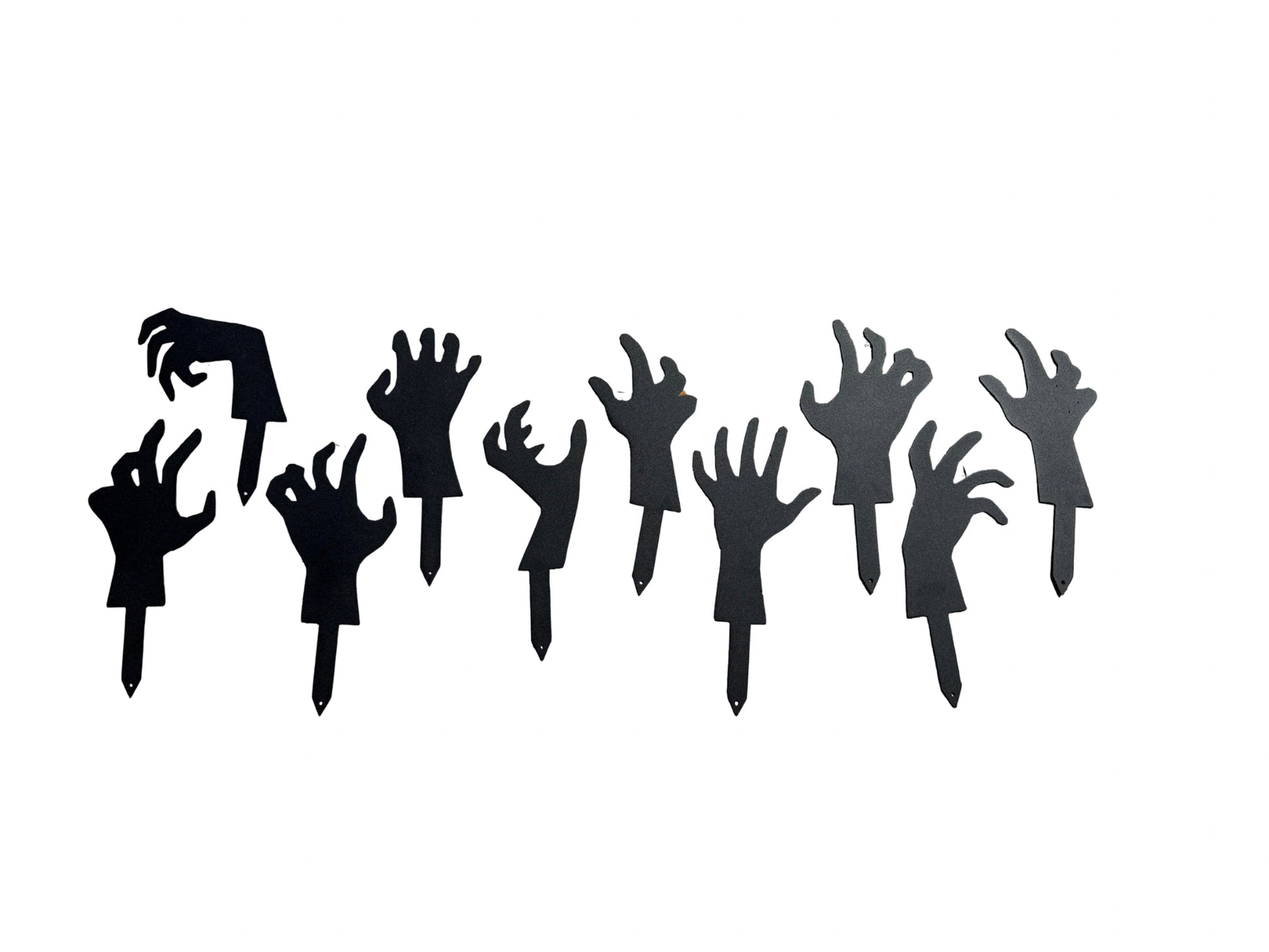 Transform your yard into a spooky spectacle with these creepy zombie hands! Crafted from durable metal, these eerie hand silhouettes emerge from the ground, adding a chilling touch to your Halloween decor. This set includes ten different hands, measuring eight to ten inches above the ground, with stakes underneath to keep them in place. Perfect for lawns, gardens, or pathways, they create an eye-catching display that's sure to delight trick-or-treaters and haunt your neighbors. Easy to install and powder coated to make them weather-resistant, these hand are a must have for a frightfully fun season. Get yours today and raise the scare factor!