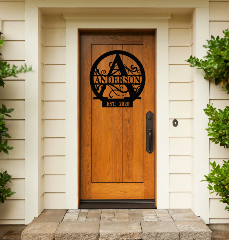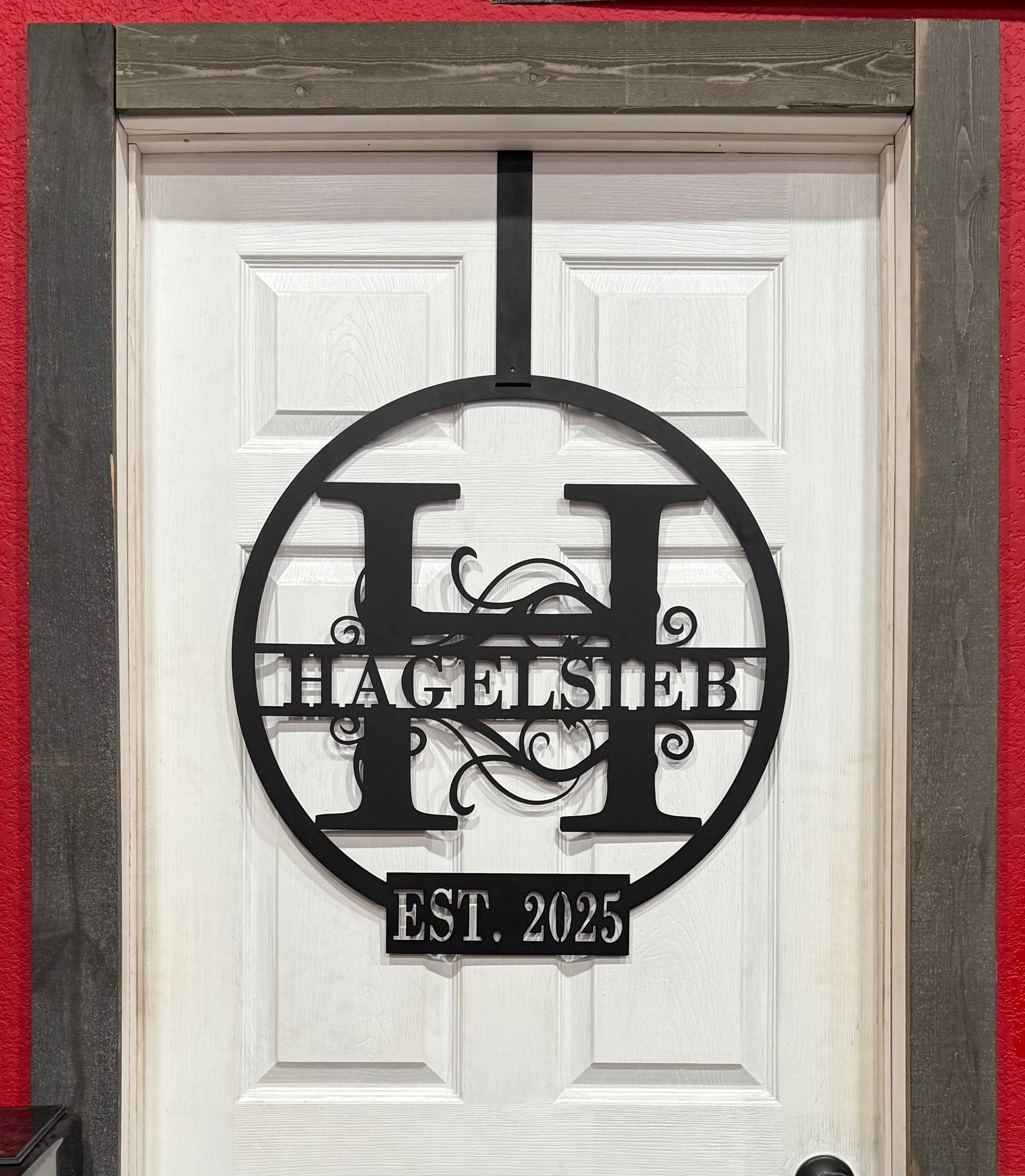 This elegant metal wreath features a circular design with a prominent initial at its center, surrounded by intricate, swirling accents that add a touch of sophistication. The space across the middle is reserved for a customizable last name, with an area below for a personalized year, such as an establishment or milestone date. Crafted from durable metal, the wreath showcases a sleek finish, making it a striking addition to home decor, entryways, or outdoor spaces. Its sturdy construction and detailed craftsmanship make it a timeless, versatile piece suitable for gifting or commemorating special occasions. Weddings, showers, housewarming, holidays, birthdays, or just because; this wreath is perfect for every occasion!